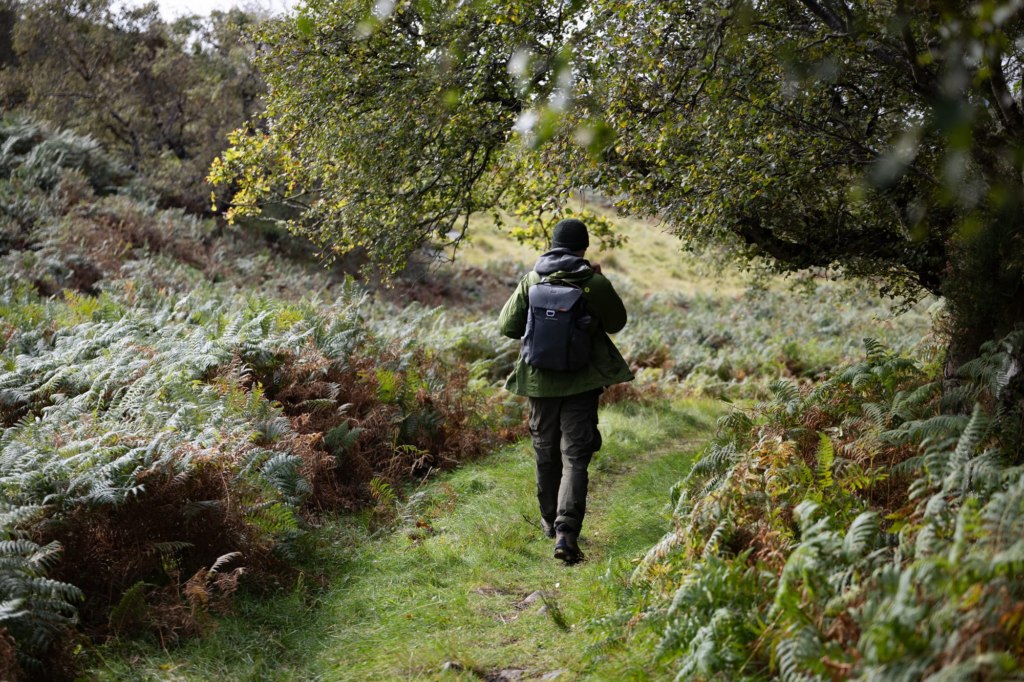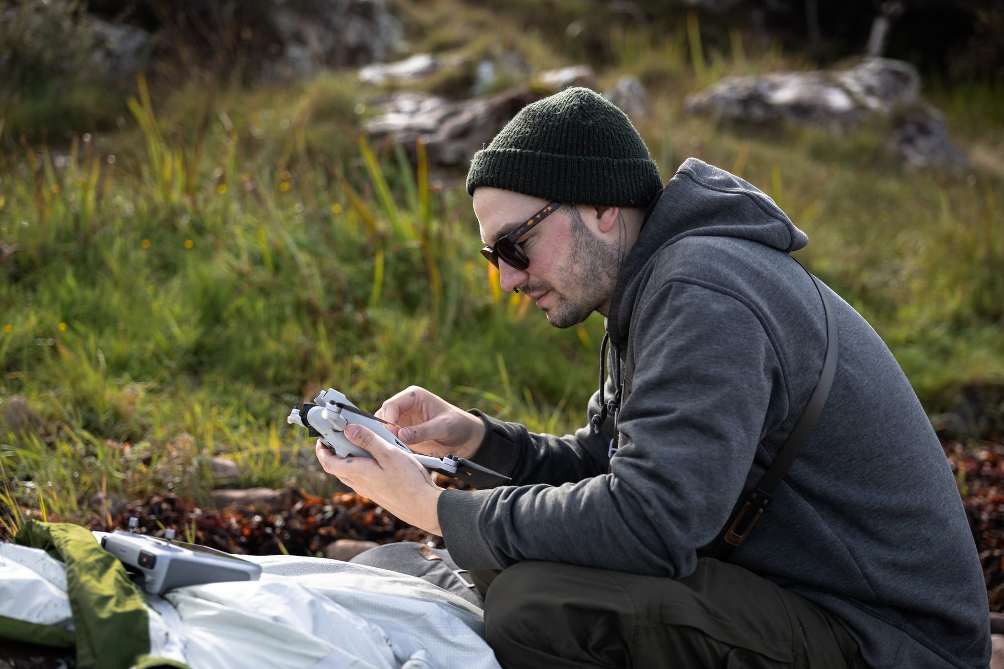 Bunte Heide und Farne, Drohnenkapitän Kim sowie besagter Strand.